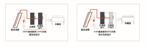u 部分負(fù)荷運行:主壓縮機運行,60%的冷媒作制冷循環(huán),這樣蒸發(fā)盤管和冷凝盤管相對而言能力過量,冷媒吸入壓力增加而排出壓力減少,部分負(fù)荷性能系數(shù)可增大到5.0,既44%的能量即可輸出65%的制冷量;