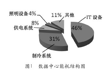 據(jù)美國采暖制冷與空調(diào)工程師學(xué)會(huì)(ASHRAE)技術(shù)委員會(huì)9.9(簡稱TC9.9)統(tǒng)計(jì)報(bào)告顯示,數(shù)據(jù)中心各部分的用電量分布大致如圖1所示。由圖可見,IT系統(tǒng)、制冷系統(tǒng)和供電系統(tǒng)是數(shù)據(jù)中心能耗大戶。