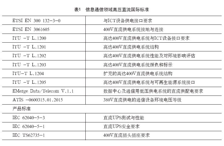 關(guān)于高壓直流供電技術(shù)國際標(biāo)準(zhǔn)匯總表如表1所示。