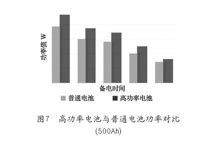 電池的放電倍率是指電池在規(guī)定的時(shí)間內(nèi)放出其額定容量時(shí)所需要的電流值,在數(shù)據(jù)值上等于電池額定容量的倍數(shù),通常以字母C表示。如電池的標(biāo)稱額定容量為600mAh為1C(1倍率),300mAh則為0.5C,6Ah為10C,以此類推。高倍率電池能大電流放電與其極板設(shè)計(jì)有關(guān),能在大電流放電之后依然能放出電池容量的很大一部分。而普通電池在大電流放電時(shí),只能放出很少一部分能量。圖7為某供應(yīng)商提供的高倍率電池與普通的閥控式密封鉛酸蓄電池進(jìn)行放電功率的比較。從數(shù)據(jù)中可以明顯看出,在相同的備電時(shí)間,高倍率電池比普通電池的功率值大。