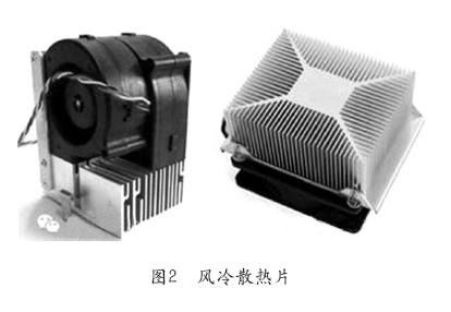 風冷散熱片是最常見的散熱器件,一般是導熱性能比較好的鋁或銅等材料,加工成散熱翅片以增加散熱面積和效率,通過特殊的介質(通常是導熱硅脂)緊貼住發(fā)熱量很大的芯片,然后再在散熱片上固定一個風扇來增加流速,提升換熱能力,更快帶走熱量,從而達到對芯片散熱的目的。提升風冷散熱的途徑是提高散熱面積、提高換熱系數(shù)、提升輻射散熱效率、使用散熱效率更佳的材料、粘合充分接觸保證降低傳導熱阻等,風冷散熱片如圖2所示。