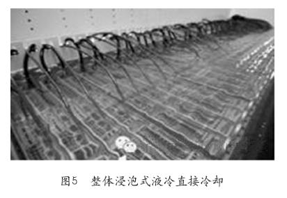 直接冷卻是采用密閉的氟化液等礦物質直接浸泡冷卻IT設備的芯片、內(nèi)存等發(fā)熱部件,形成密封的一級散熱循環(huán)系統(tǒng),而二級循環(huán)系統(tǒng)可以采用自然風冷或者冷卻水系統(tǒng)進行冷卻。對比間接制冷系統(tǒng),直接冷卻對發(fā)熱元器件冷卻的均勻度更好,冷卻液溫度可以更高,尤其是選擇一定溫度下相變的液體,局部散熱能力強,散熱效果更好;比如對于60℃的芯片,可以采用50℃冷卻水或冷卻蒸發(fā)溫度在55~60℃的冷媒流體,因此,即使夏季45℃高溫天氣,也可以實現(xiàn)直接新風冷卻或者冷卻塔,從而數(shù)據(jù)中心實現(xiàn)全年自然冷卻,降低能耗,這對于全球溫帶和熱帶區(qū)域實現(xiàn)制冷系統(tǒng)的高效帶來了突破,是有競爭力的制冷方案。整體浸泡式液冷直接冷卻如圖5所示。