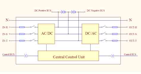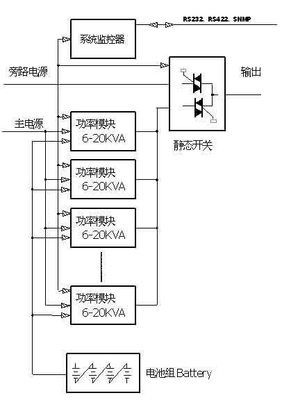 系統(tǒng)為模塊式結(jié)構(gòu),由靜態(tài)開(kāi)關(guān)模塊、系統(tǒng)監(jiān)控模塊和1到24個(gè)功率模塊并聯(lián)組成。