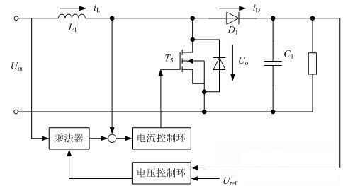 輸入功率因數(shù)校正電路如圖2所示主要由功率管T5、電感L1、二極管D1、電容C1組成。它為輸入部分提供功率因數(shù)校正功能,并且提升電壓至400V。