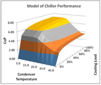 經(jīng)常有人問(wèn):“我們?nèi)绾斡?jì)算或模擬預(yù)期的性能?”答案很簡(jiǎn)單:數(shù)據(jù)中心中的每一個(gè)設(shè)備的性能都可以通過(guò)一個(gè)數(shù)學(xué)模型來(lái)確定。而數(shù)據(jù)中心供應(yīng)商具備這個(gè)信息庫(kù),無(wú)論是UPS、變壓器、風(fēng)扇或水泵的負(fù)載與效率。圖3顯示了一個(gè)特定的制冷機(jī)對(duì)環(huán)境溫度和負(fù)載的性能系數(shù)。