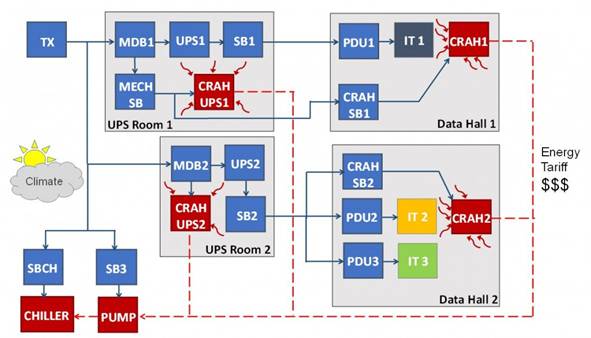 圖4 確定電源和冷卻鏈的組合數(shù)據(jù)中心的性能模型(藍(lán)色連接代表的是電源鏈,紅色連接代表的是冷卻鏈)。