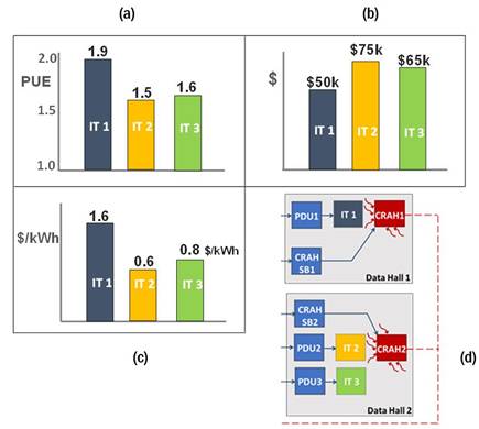 鑒于工程問(wèn)題可以通過(guò)性能模型在圖4中得到解決,報(bào)告活動(dòng)的指標(biāo)成為一件容易的事。這些指標(biāo)可能包括客戶級(jí)PUE,總成本和交付成本(美元/千瓦時(shí))的類型,為高級(jí)管理層提供商業(yè)智能和決策能力。圖6顯示了在圖4中建模的數(shù)據(jù)中心中每個(gè)客戶的分配的度量標(biāo)準(zhǔn)。輸出來(lái)自工程模型,認(rèn)為能源管理費(fèi)用,是基于成本的資本和維護(hù)成本的指標(biāo)。考慮圖6(a);分配客戶IT的PUE(1)比IT(2)和IT(3)要高很多。這一結(jié)果是作業(yè)績(jī)效模型圖4的結(jié)果,而由不同系列的UPS和不同類型CRAH單元組成的IT(1),比IT(2)和IT(3)交付成本更高。