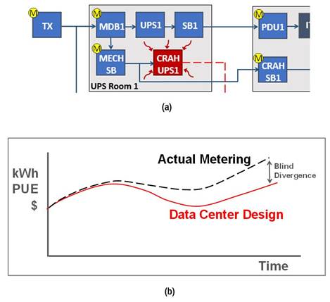 在圖5的(a)中所示的例子中,儀表被提名和數(shù)據(jù)中心的關(guān)鍵性能指標(biāo)(KPI)跟蹤與預(yù)期設(shè)計(jì)性能(參見(jiàn)圖5b)。區(qū)別在哪里開(kāi)始,見(jiàn)圖(5b)。它只是通過(guò)繪制的健康預(yù)期的設(shè)計(jì)從模型讀取可見(jiàn)。發(fā)散的常見(jiàn)原因是人工干預(yù),其中有人已經(jīng)改變了設(shè)置,冷卻系統(tǒng)或系統(tǒng)已經(jīng)響應(yīng)產(chǎn)生不利于載荷狀況,但只是在一定程度上還尚未成為危險(xiǎn)項(xiàng)目。如果早按照?qǐng)D5檢測(cè)(b)所示,設(shè)施人員能及時(shí)處理,并試圖恢復(fù)分歧的差距,并將數(shù)據(jù)中心帶回到設(shè)計(jì)。