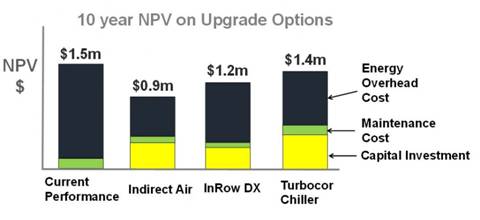 該模型需要從所有的主要數(shù)據(jù)中心項(xiàng)目的性能和數(shù)據(jù)的輸入,以允許在一個(gè)組件和/或系統(tǒng)級(jí)的數(shù)據(jù)中心容量利用率的評(píng)估。它有助于數(shù)據(jù)中心的計(jì)劃,并為即將到來(lái)的基礎(chǔ)設(shè)施維護(hù)和增強(qiáng)計(jì)劃,它可以幫助評(píng)估設(shè)施升級(jí)選項(xiàng),而不需要長(zhǎng)期的、復(fù)雜的、充滿錯(cuò)誤的電子表格。圖8給出了一個(gè)10年的凈現(xiàn)值(NPV)為冷卻系統(tǒng)升級(jí)的計(jì)算,考慮到對(duì)能源的開(kāi)銷,維修成本和所需的資本投資。在這種情況下,它很容易在較短的時(shí)間內(nèi)評(píng)估升級(jí)選項(xiàng)的內(nèi)部工程團(tuán)隊(duì),并排除那些不提供一個(gè)成本效益的商業(yè)案例。在圖8的基礎(chǔ)上,安裝Turbocor制冷機(jī)組10年以上將對(duì)成本沒(méi)有什么影響,而采用間接冷卻系統(tǒng)可以節(jié)約60萬(wàn)美元。