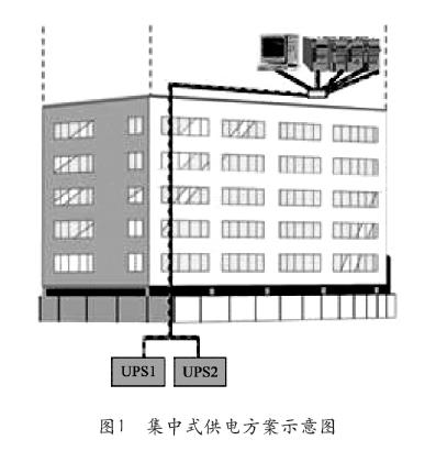 由一臺(tái)UPS組成單機(jī)供電系統(tǒng)、多臺(tái)UPS組成并聯(lián)供電或雙總線供電系統(tǒng),再通過(guò)配電集中給負(fù)載供電,這種供電方案一般情況下UPS系統(tǒng)與機(jī)房用電設(shè)備是分開的。該供電方案一般UPS的單機(jī)容量在200~400kVA較多,供電示意圖如圖1所示。