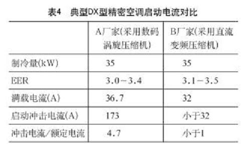 根據(jù)A、B兩個(gè)廠家提供的技術(shù)參數(shù)并結(jié)合測試結(jié)果,采用數(shù)碼渦旋壓縮機(jī)的DX型精密空調(diào),其啟動(dòng)沖擊電流約為額定電流的5倍;而采用直流變頻壓縮機(jī)的DX型精密空調(diào),其啟動(dòng)電流小于額定電流。