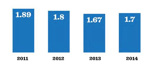 提升數據中心能源效率的第一步,便是審慎評估能源使用效率(PUE,Power Usage Effectiveness),簡單來說,PUE就是數據中心總耗電除以IT設備總耗電,或是數據中心總設施消耗的能源除以IT設備消耗的能源。PUE是由GreenGrid所召集的政府及產業(yè)專家組成的項目小組所制定的一項指標,不僅信賴度高,而且可以用來檢驗機房的能源效率,可以廣為適用于一般數據中心,目的是建立一個“一致且可重復使用的衡量指標”,提供數據中心管理者持續(xù)監(jiān)控并改善能耗狀況。根據UptimeInstitute于2014年進行的調查研究顯示,全球業(yè)界平均PUE為1.7,高于2013年的1.67,但低于2012年的1.8,表示機房節(jié)能仍有改善空間(如圖1)。