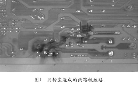 當(dāng)UPS采用風(fēng)冷散熱時(shí),會(huì)將空氣中的粉塵吸入U(xiǎn)PS內(nèi)部。粉塵粘附在風(fēng)扇或電路板上,影響UPS散熱,并有造成電路板短路的風(fēng)險(xiǎn)。圖1為京滬高鐵箱變UPS電路板因粉塵導(dǎo)致的短路故障的照片。