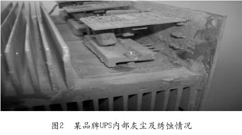 UPS對(duì)環(huán)境濕度有嚴(yán)格的要求,要求使用環(huán)境濕度10~90%RH不能結(jié)露。若濕度過(guò)高,在遇冷氣時(shí),會(huì)在設(shè)備內(nèi)形成水霧或細(xì)水珠,尤其在南方潮濕的雨季,結(jié)露容易造成電路板短路。商用UPS一般按照IEC529-598規(guī)定的IP20等級(jí)設(shè)計(jì),即可以防止直徑大于12.5mm的外物侵入,防止手指接觸內(nèi)部零件,沒(méi)有對(duì)濕度的防護(hù)要求。高速鐵路電力使用的UPS裝于箱變內(nèi),在戶外使用,箱變內(nèi)沒(méi)有溫濕度調(diào)節(jié)系統(tǒng),使用環(huán)境惡劣。圖2為箱變內(nèi)某品牌UPS內(nèi)部灰塵及銹蝕情況。