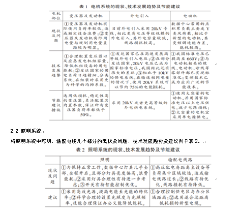 將電機系統(tǒng)中變壓器、發(fā)電機、外電引入、電動機幾個部分的現(xiàn)狀及問題、技術(shù)發(fā)展趨勢及建議列于表1。