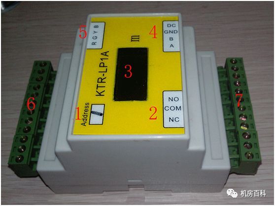 1標(biāo)有Address下面的空白框內(nèi)寫的是RS485的通信地址,2表示最邊上的三個(gè)接頭從外到內(nèi)的標(biāo)號(hào)分別為NC、COM、NO。3是顯示屏,正常運(yùn)行沒有漏液顯示的是”no leak“,當(dāng)有漏發(fā)生,顯示的數(shù)值表示從漏液控制器到發(fā)生漏液的距離,單位是米。當(dāng)顯示的是”Error“表示漏液感應(yīng)線有故障。4表示最邊上的4個(gè)接線端子從外到內(nèi)分別為DC、GND、B、A。5表示從最邊上的4個(gè)接線端子從外到內(nèi)分別為B、Y、G、R。其它接線端子不用接。