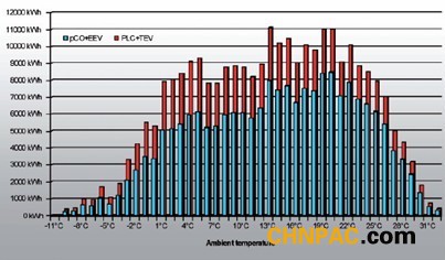 E2V的高效調(diào)理性和適應(yīng)能力意味著空調(diào)體系能夠運轉(zhuǎn)在最大功率下。當(dāng)室外溫度合當(dāng)令(夜間或冬秋季月份),可將冷凝壓力下降至10bar,從而下降了耗電量。另一方面,機械式熱力脹大閥總是強制機組運轉(zhuǎn)在冷凝壓力超越17bar的情況下。在較熱的氣候情況下,電子脹大閥的長處是能夠更好地利用蒸騰器;在較冷的氣候下,其能夠下降機組的運轉(zhuǎn)壓力,從而下降耗電量,進步功率。