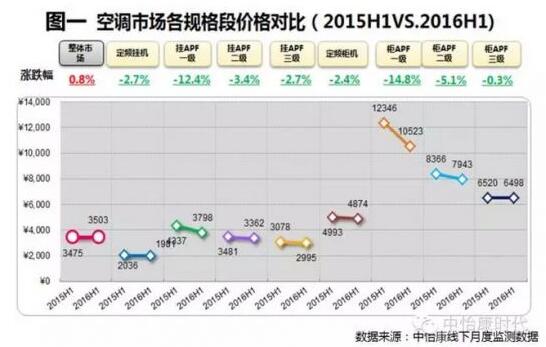第二,除APF一級柜機(jī)外,絕大部分規(guī)格產(chǎn)品均價開始穩(wěn)定。雖然從各規(guī)格產(chǎn)品均價同比降幅來看,所有規(guī)格產(chǎn)品的均價都在下降,其中尤以高能效產(chǎn)品為重.(見圖一)。但這其實是由于空調(diào)產(chǎn)品在2015下半年進(jìn)行了大幅降價。